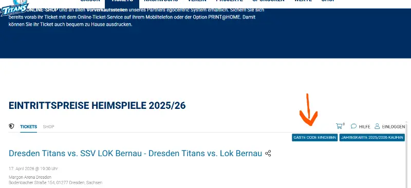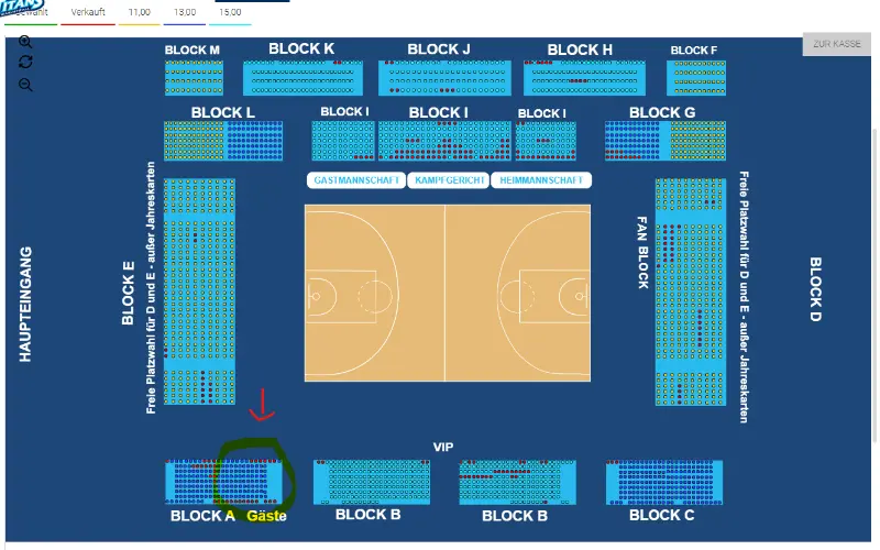 Wir werden im Gästeblock A sitzen. (Auf dem Saalplan unten
